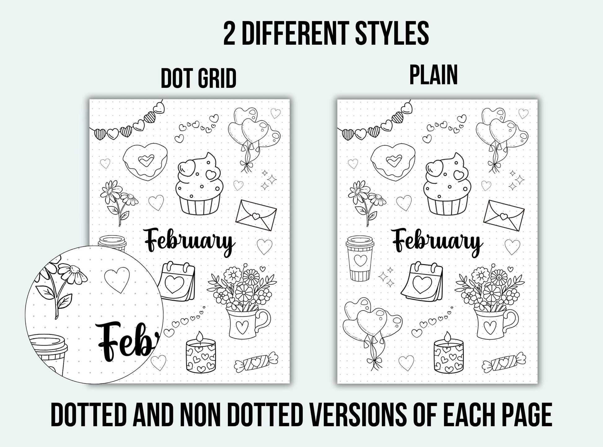 This 12 monthly title page set includes two sets of planner cover pages - one set with dot grid perfect for bullet journals and the other monthly cover pages with plain backgrounds.