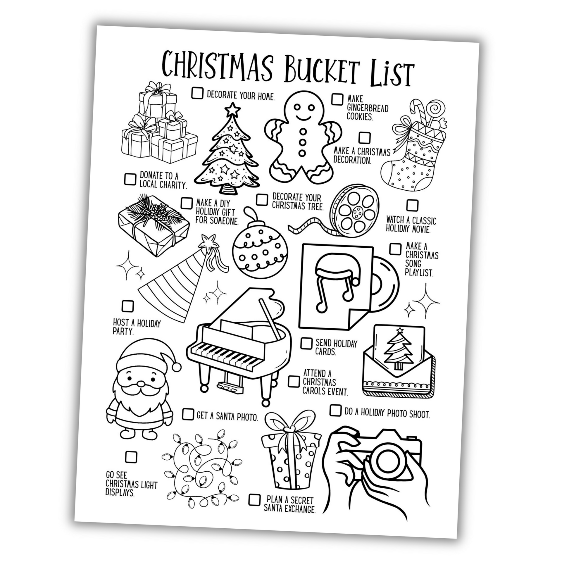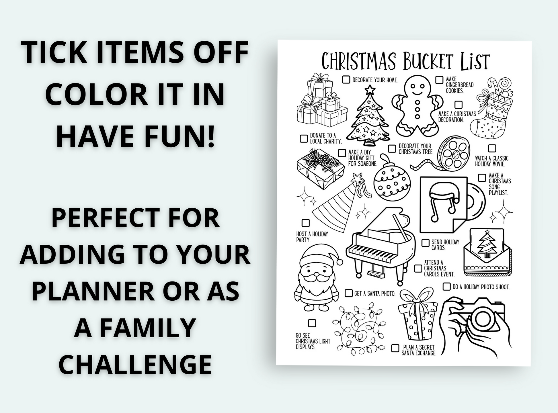 The ultimate Christmas Bucket List. This printable Christmas activities list is full of fun Christmas to do list activities and holiday bucket list items, making this a fun addition to your planner. Color it in or leave your bucket list template simple as you tick items off. Turn your winter break into one filled with adventures!