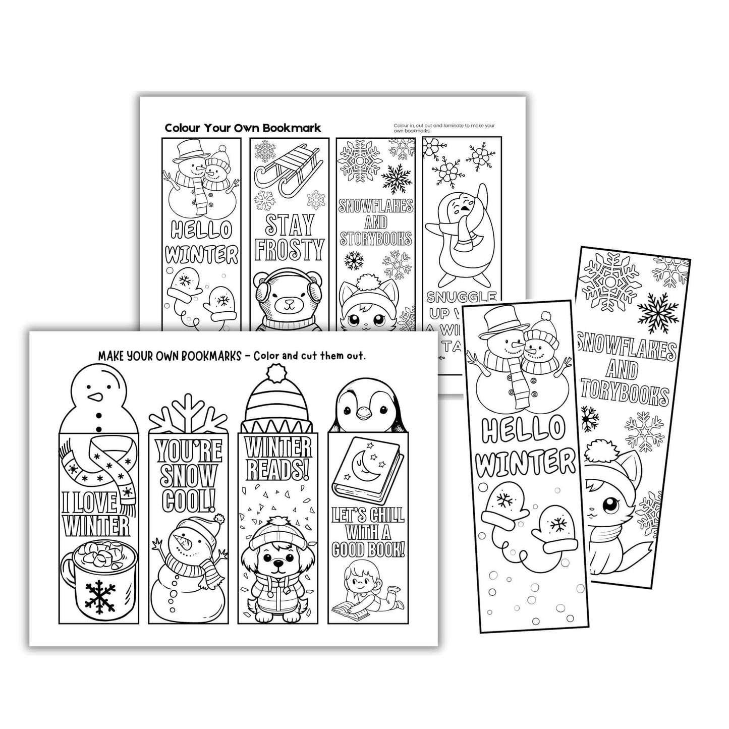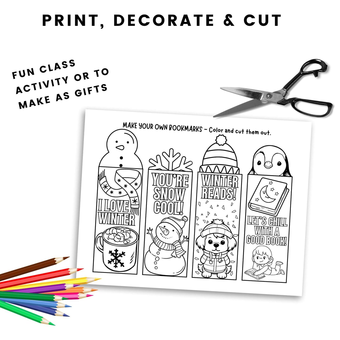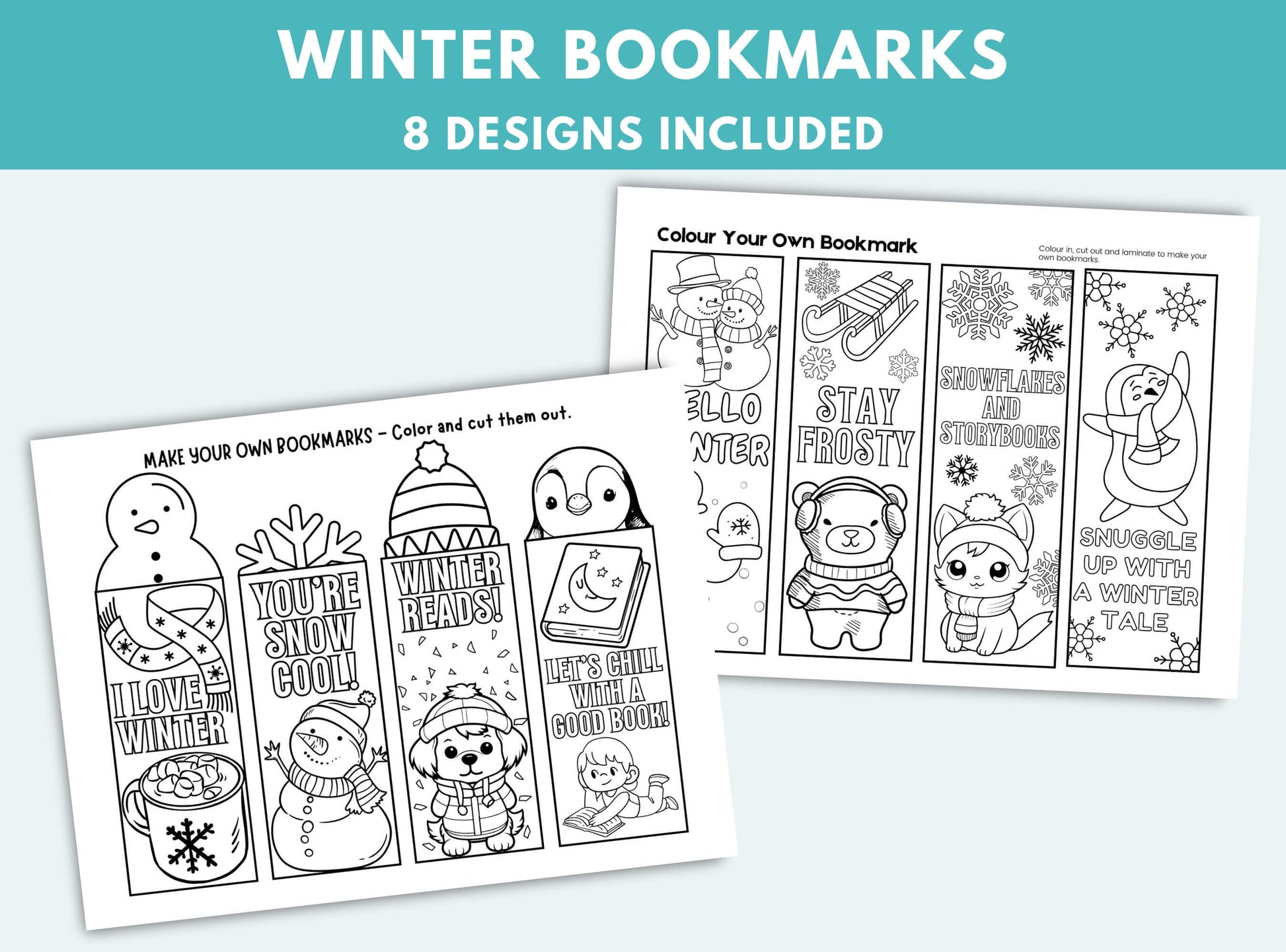 There are 8 Winter-themed bookmarks included with cute designs to color.
